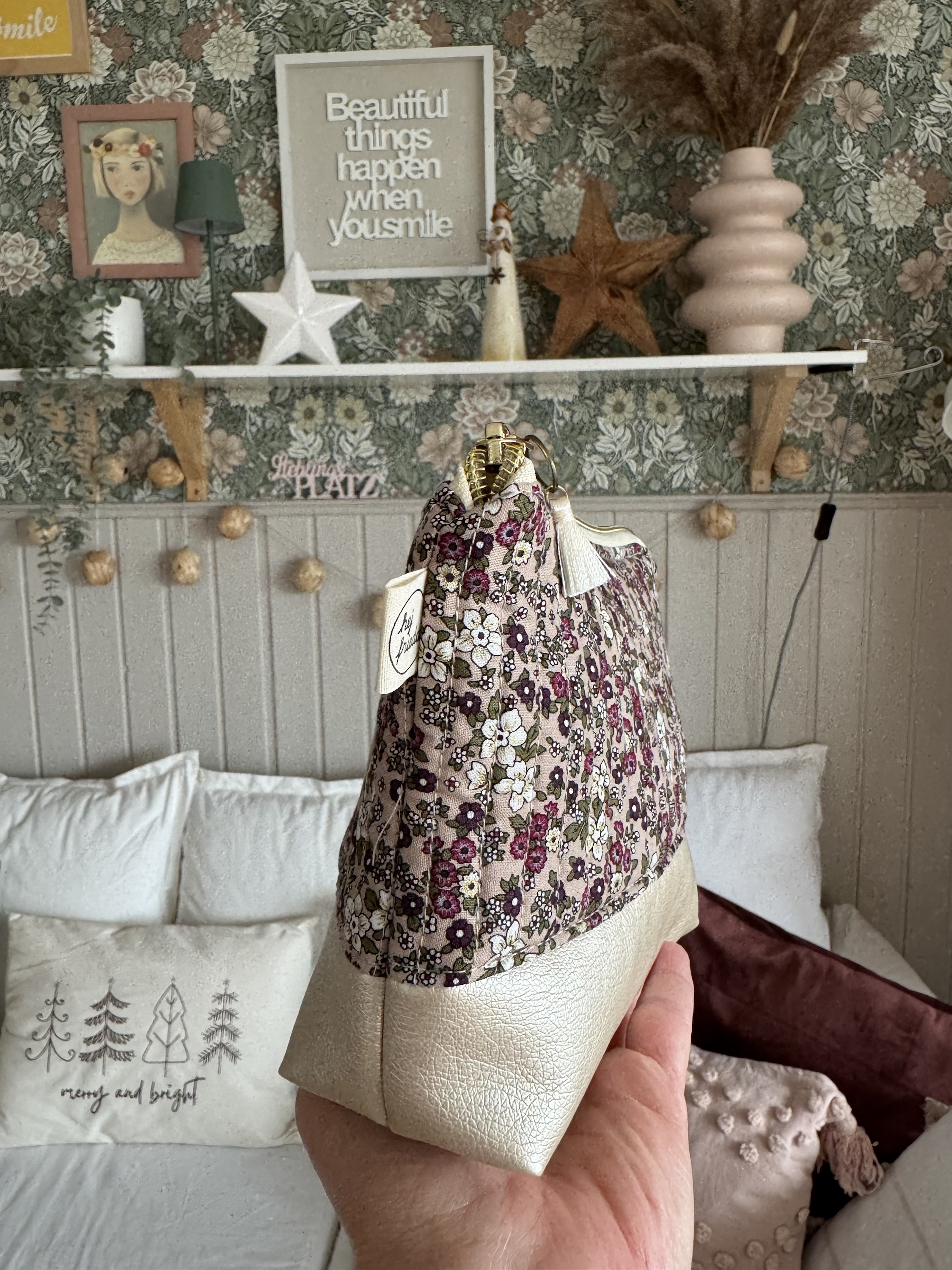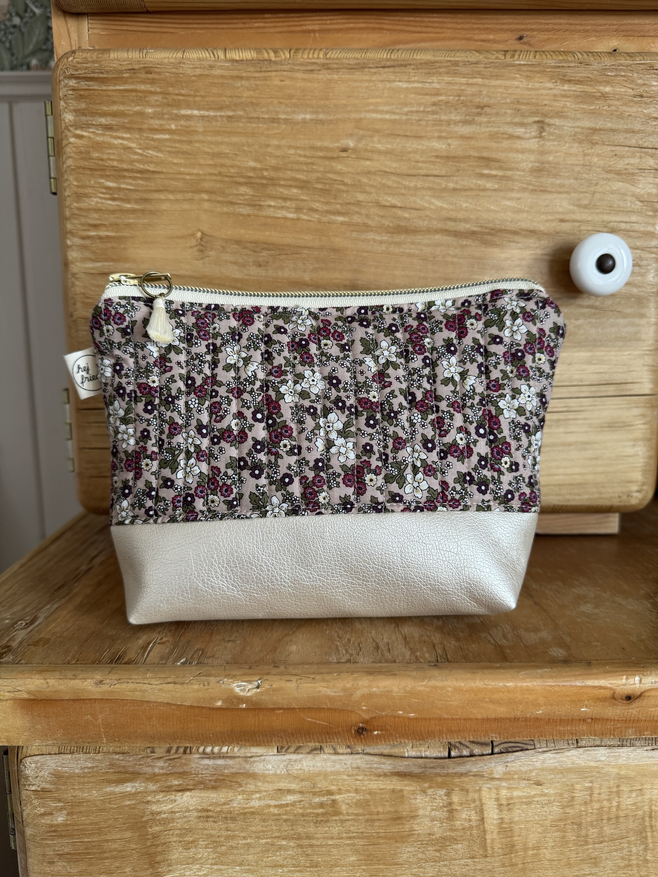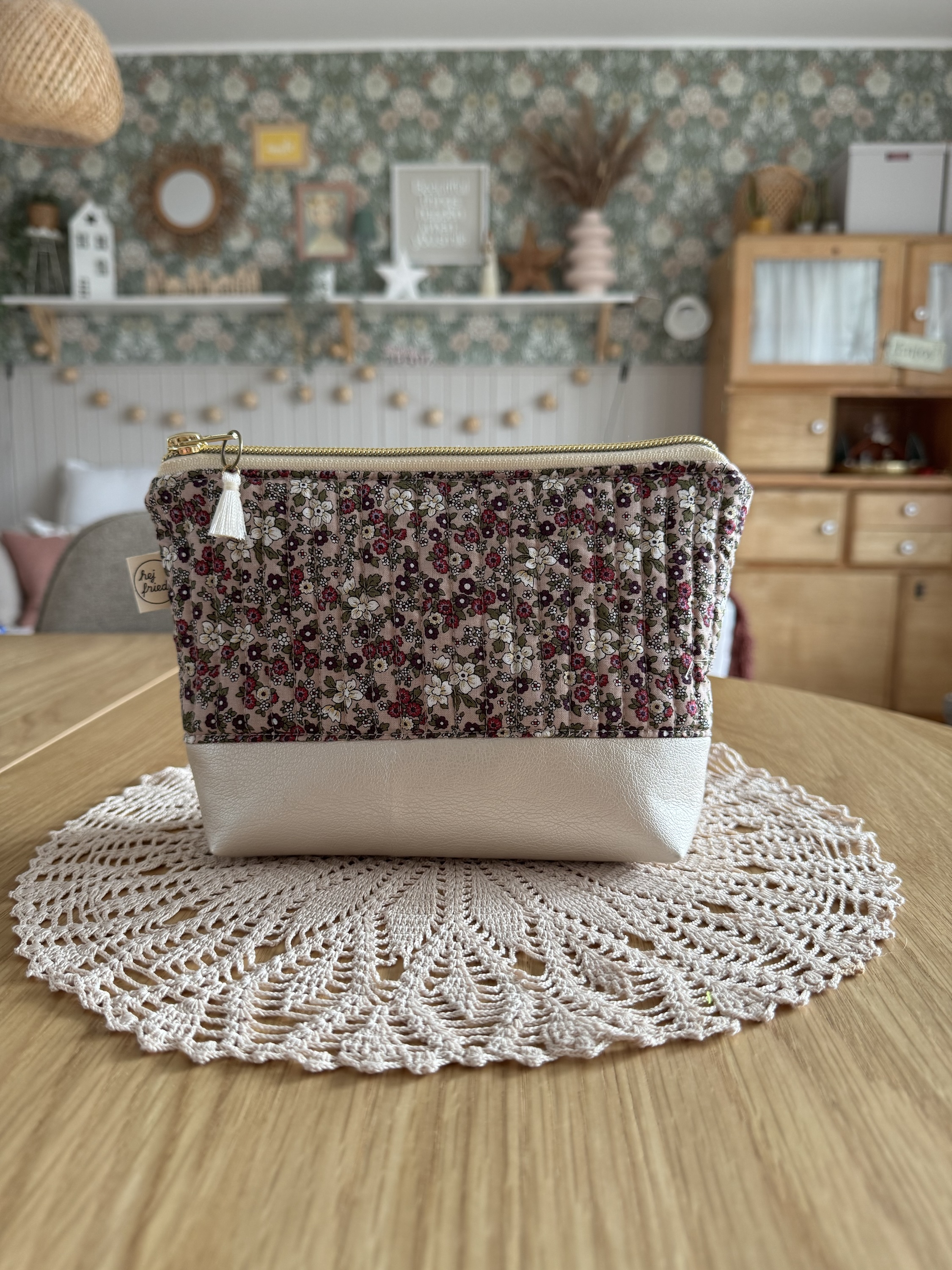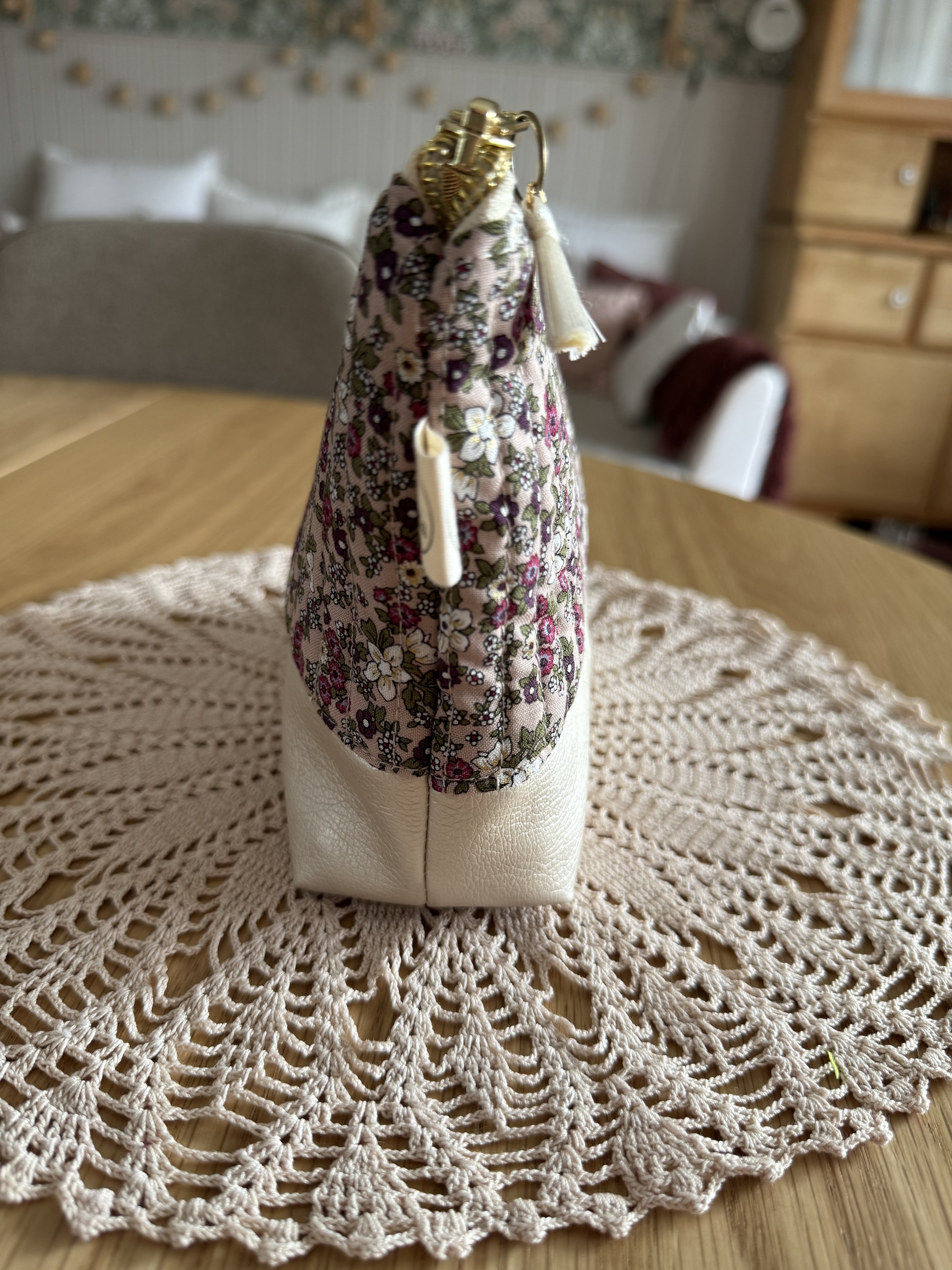 Das Kosmetiktäschchen MARA ist aus einem süßen Blümchenstoff und schönem Kunstleder gefertigt. Der Baumwollstoff wurde gequiltet, dies gibt dem Täschchen eine wunderbare Haptik. Die pastelligen Farben, der goldene Reißverschluss und die kleine Quaste sind zusätzlich hübsche Details.